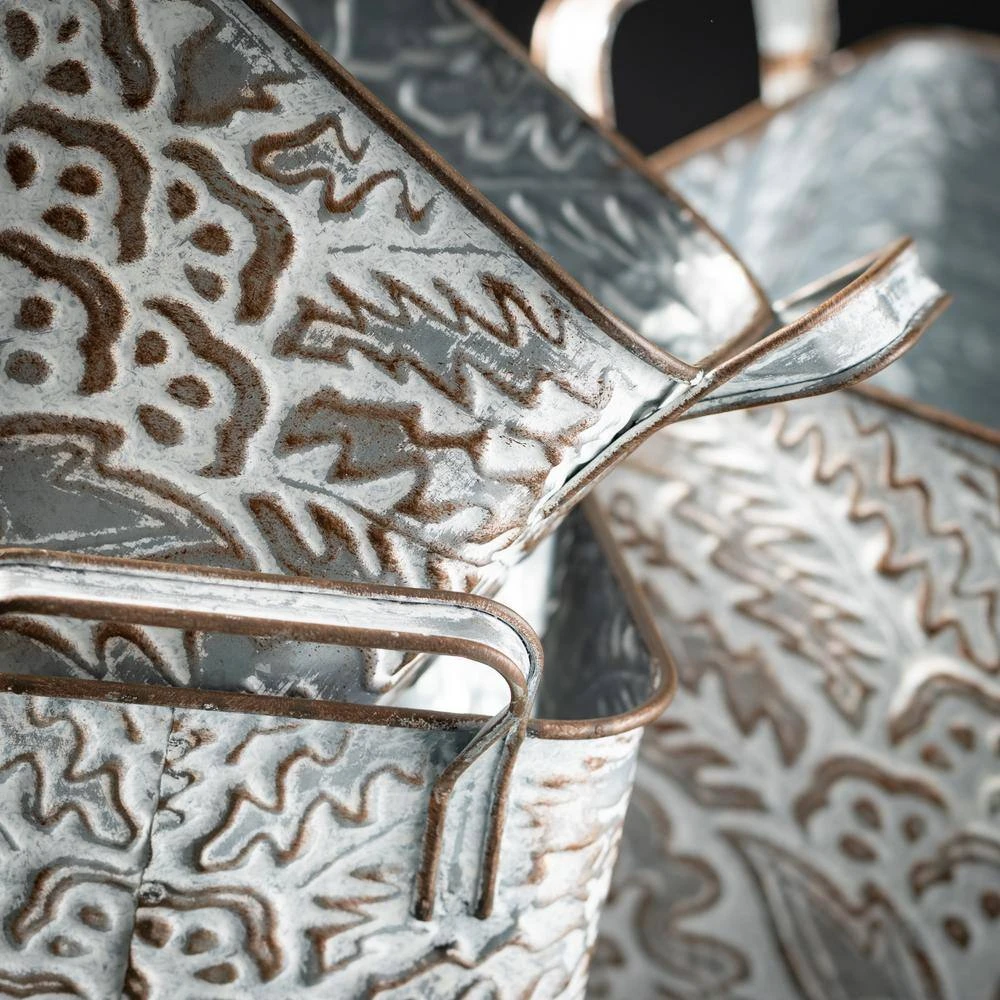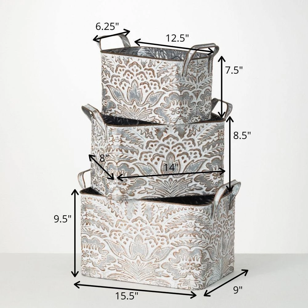Embossed with the familiar Sullivan’s flourish pattern, this trio of metal containers come in 3 graduating heights of 7.5 in., 8.5 in. and 9.5 in. Accompanied with built-in loop handles, these planters are a cinch to move from room to room. Exclusive exploded artichoke pattern. Over the last 52-years, Sullivans has become an industry leader in home decorations. Our brand is rooted in tradition while incorporating modernized trends to keep your home looking up to date with timeless style. Here at Sullivans, we pride ourselves on creating product designs focused on quality and value, ensuring that our customers have access to beautiful products at reasonable price points.