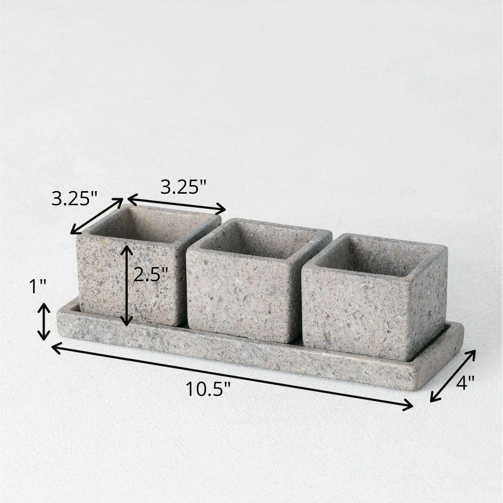 - Planters measure 10.5″L x 4″W x 3.25″H; 3.25″L x 3.25″W x 2.5″H; 10.5″L x 4″W x 1″H